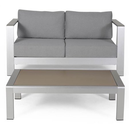 Alec Outdoor Aluminum Loveseat And Tempered Glass Topped Coffee Table Silver And Gray