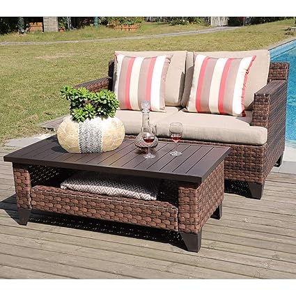 Sunsitt 2 Piece Wicker Outdoor Loveseat And Coffee Table Patio Conversation Set With Beige Cushions Brown