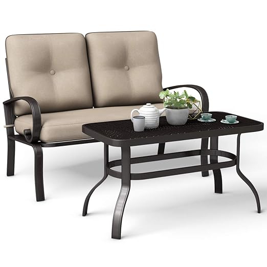 Giantex 2 Pcs Patio Loveseat With Coffee Table Outdoor Bench With Cushion And Metal Frame Loveseat Furniture Set Sofa For Garden Yard Patio Or