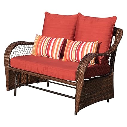 Sundale Outdoor 2 Person Wicker Loveseat Glider Bench Chair Patio Porch Swing With Rocker Red Cushions And Striped Pillows