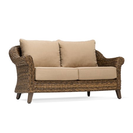 Blue Oak Bahamas Wicker Outdoor Loveseat With Sunbrella Canvas Heather Beige Cushion