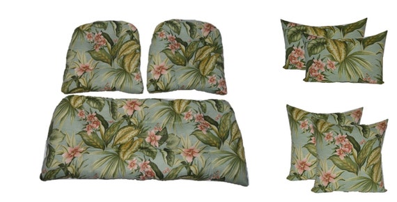 Outdoor Wicker Cushion And Pillow 7 Pc Set Wicker Loveseat Chair Cushions 17 And Lumbar Pillows Jamaican Mist Tropical Floral
