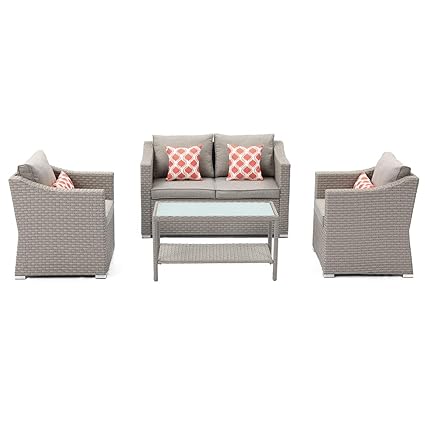 Mcguffey 4 Piece Patio Conversation Sofa Set Furniture Outdoor Wicker Loveseat W Light Gray Cushions 2 Single Chairs Glass Top Coffee Table 4 Coral
