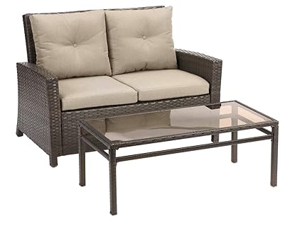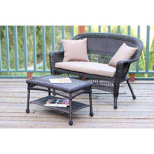 Cony Outdoor Wicker Loveseat And Coffee Table Set Dark Brown With Beige Cushions