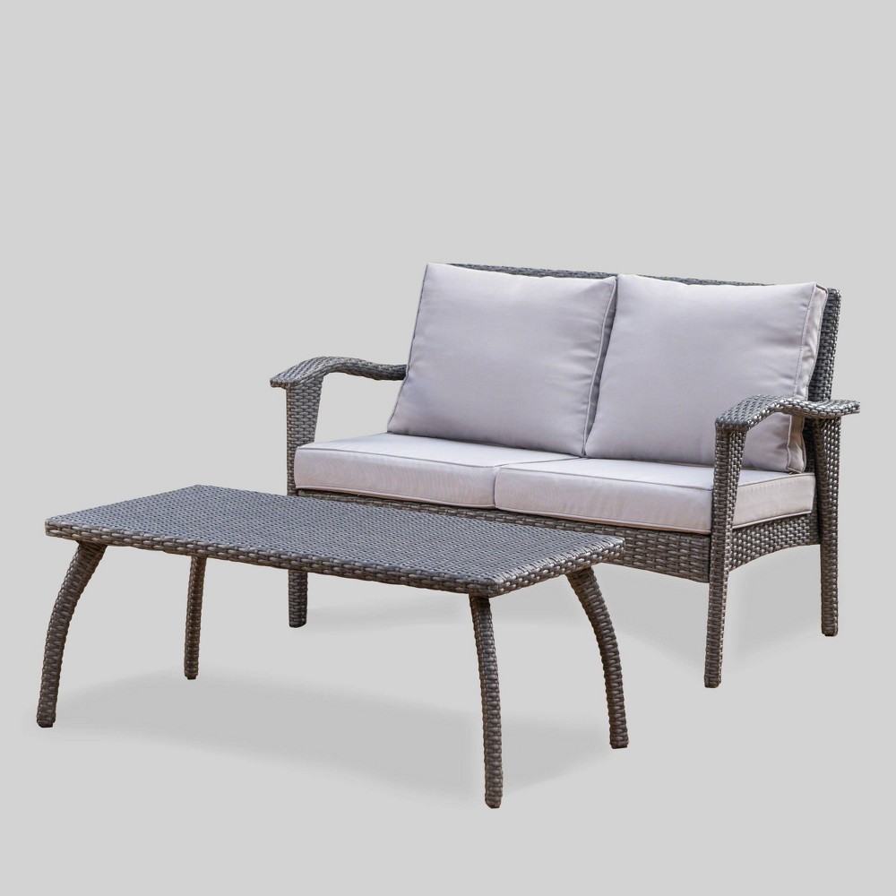 Gdf Studio Aspen Outdoor Wicker Loveseat Table W Water Resistant Fabric Cushions Grey Silver